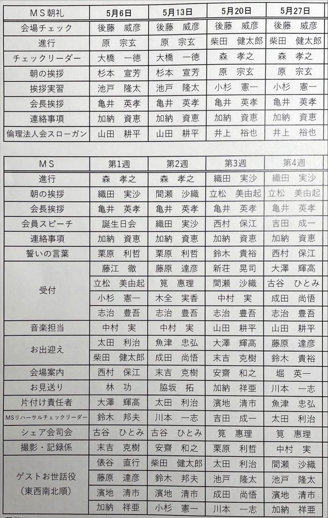 2022年5月の役割分担表を掲載しました。