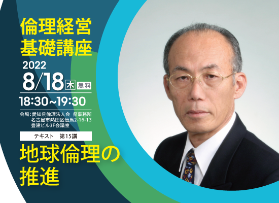 2022年8月18日 倫理経営基礎講座(18:30〜19:30) 講師 中西 浩 氏 一般社団法人倫理研究所名誉研究員 第15講「地球倫理の推進」 〈倫理経営基礎講座〉会 場:愛知県倫理法人会 県事務所20:00〜懇親会(希望者・1,500円)